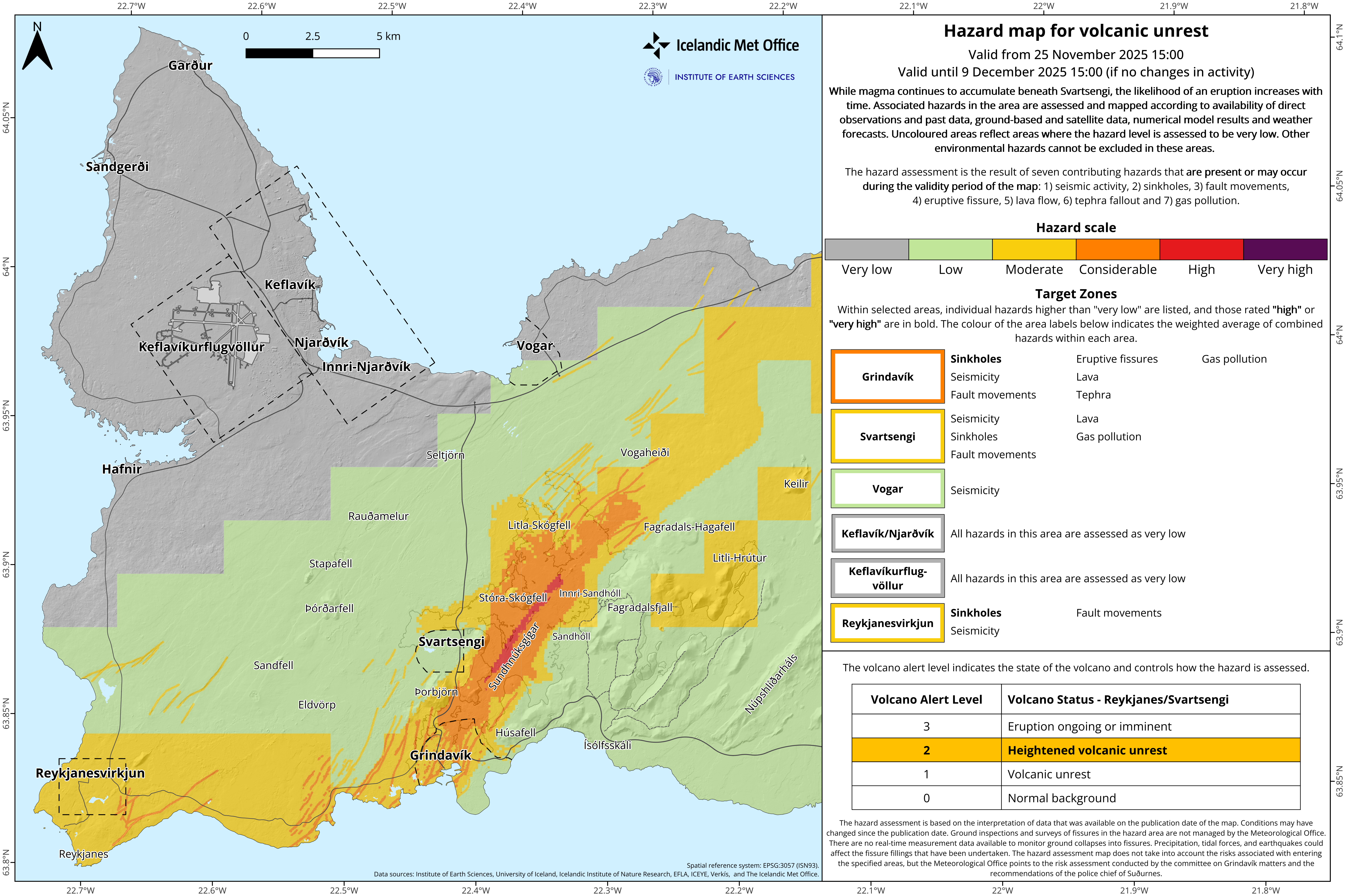 The hazard map remains unchanged until 9 December. The Icelandic Meteorological Office will continue to monitor developments closely and update the assessment if changes occur in activity.