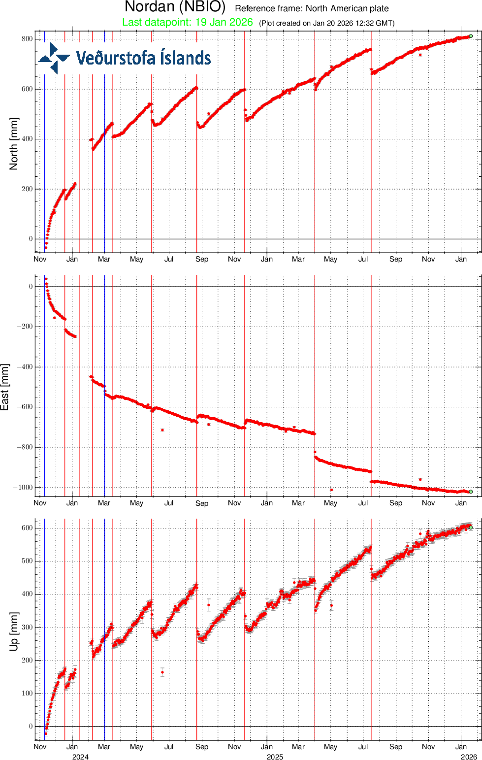 Looking back to the onset of magma accumulation beneath Svartsengi in November 2023, total uplift amounts to just under 1 meter. The rate of uplift was highest at the beginning but has gradually decreased with each subsequent event.